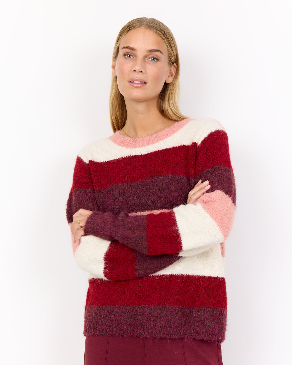 Jumper: Knit Round Neck Long Sleeve Nordic SIMONE - Burgundy Cream & Pink