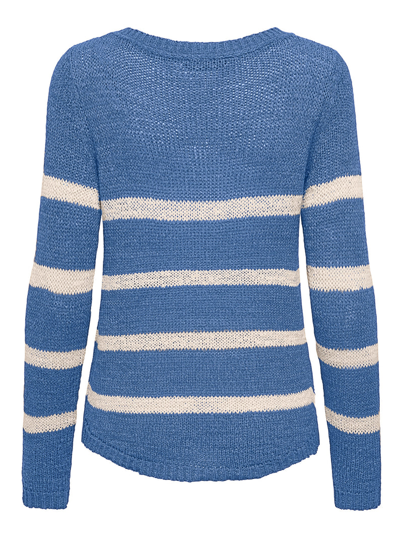 Jumper: Fine Knit Round Neck Long Sleeve Stripe GEENA XO - Riviera Blue & Cream