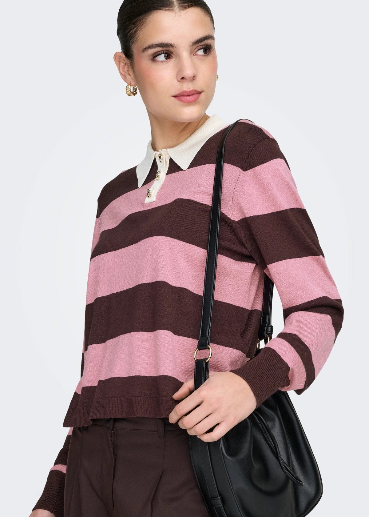 Jumper: Recycled Fine Knit Round Neck Long Sleeve Stripe DOFFY - Fuchsia Pink & Cream - Vera Moda