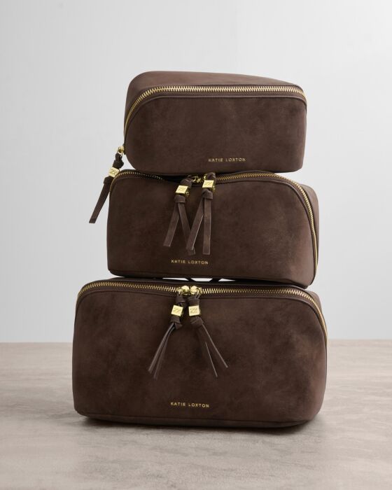 Level up your get-ready routine with our Small Makeup Bag in Brown faux suede. Its zip-around closure allows it to fully open and lay flat on any surface, providing easy access to cosmetics. Plus, with its wipeable lining, there's no need to worry about spillages. This bag is every makeup enthusiast's dream!