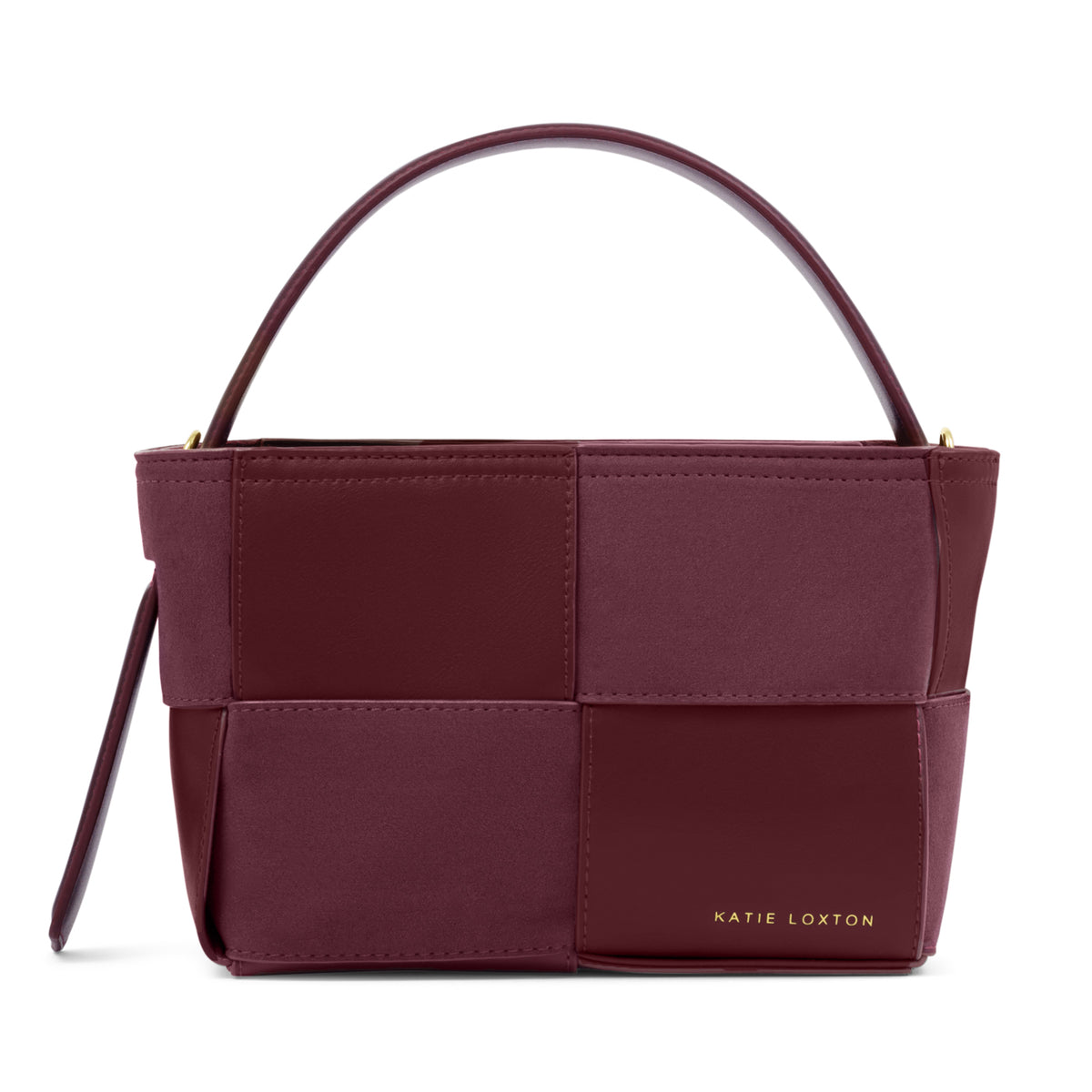 Our Taya Top Handle Bag in Cherry features a woven panel texture that adds a contemporary twist to a timeless silhouette, combining contrasting faux suede and vegan leather. Designed with an asymmetrical handle and a detachable crossbody strap for versatile styling, Taya is a standout piece for the season.
