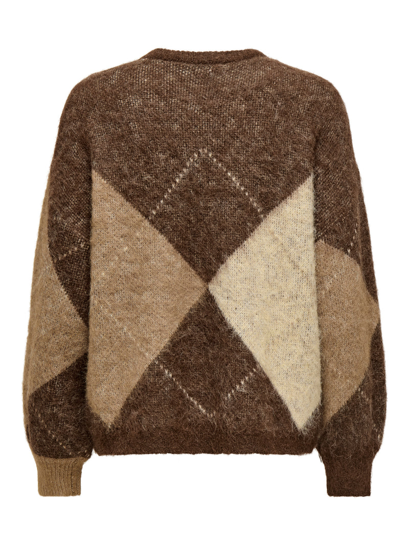 Jumper: Knit Round Neck Long Sleeve Argyle NOEME - Brown & Beige