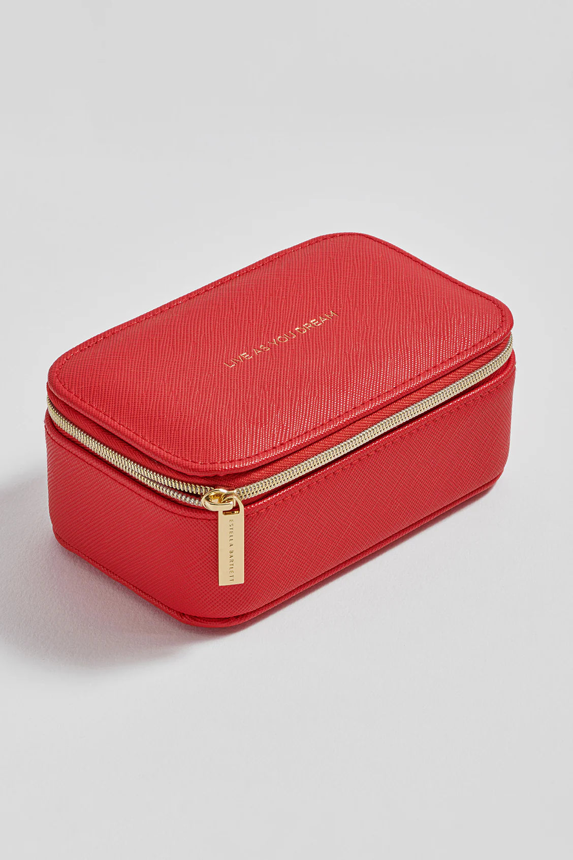 This version of our best-selling Mini Jewellery Box features a red grain exterior embossed with the inspiring message "Live as your dream". Inside, you'll find compartments to organise your bracelets, earrings and necklaces. With its petite size, this jewellery box is perfect for travelling or sitting on your dressing table.