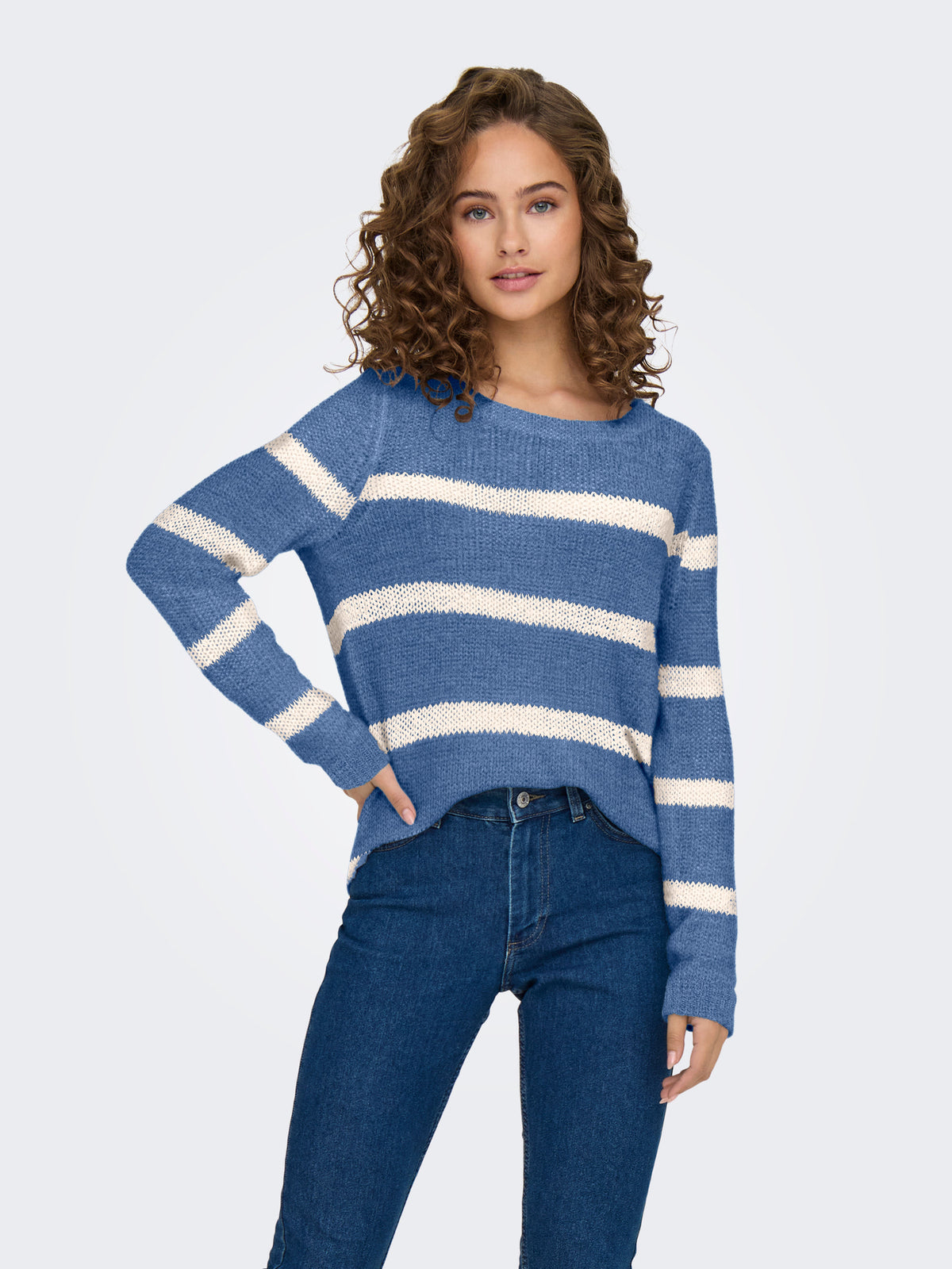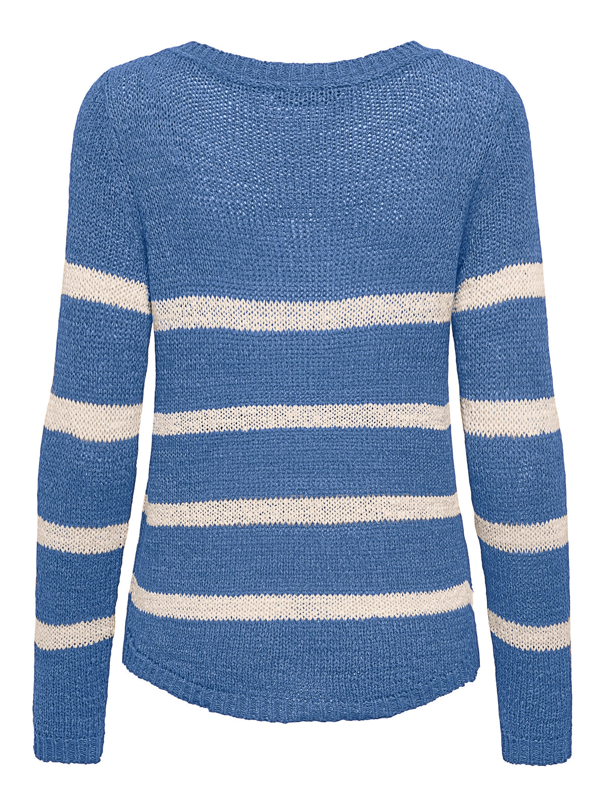 Fine Knit Round Neck Long Sleeve Stripe GEENA XO Jumper In Riviera Blue & Cream By ONLY