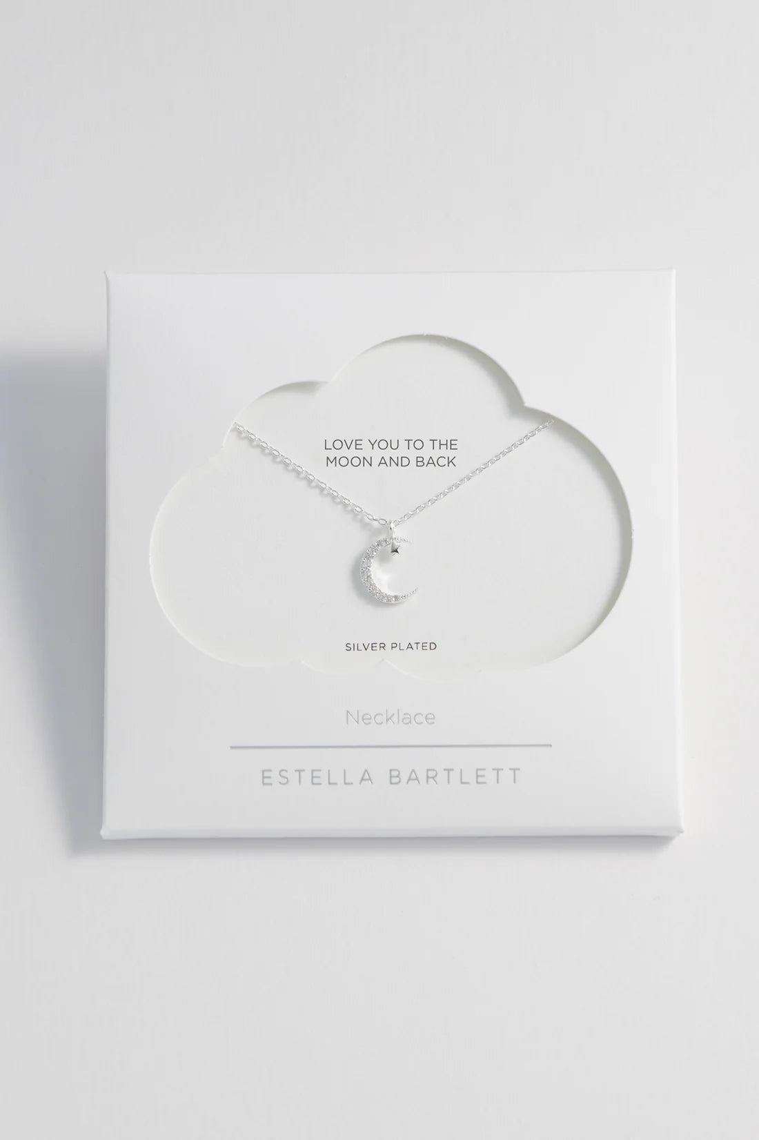 Necklace on Card: Pendant CZ Crescent Moon Star LOVE YOU TO THE MOON AND BACK - Silver Plated - Estella Bartlett