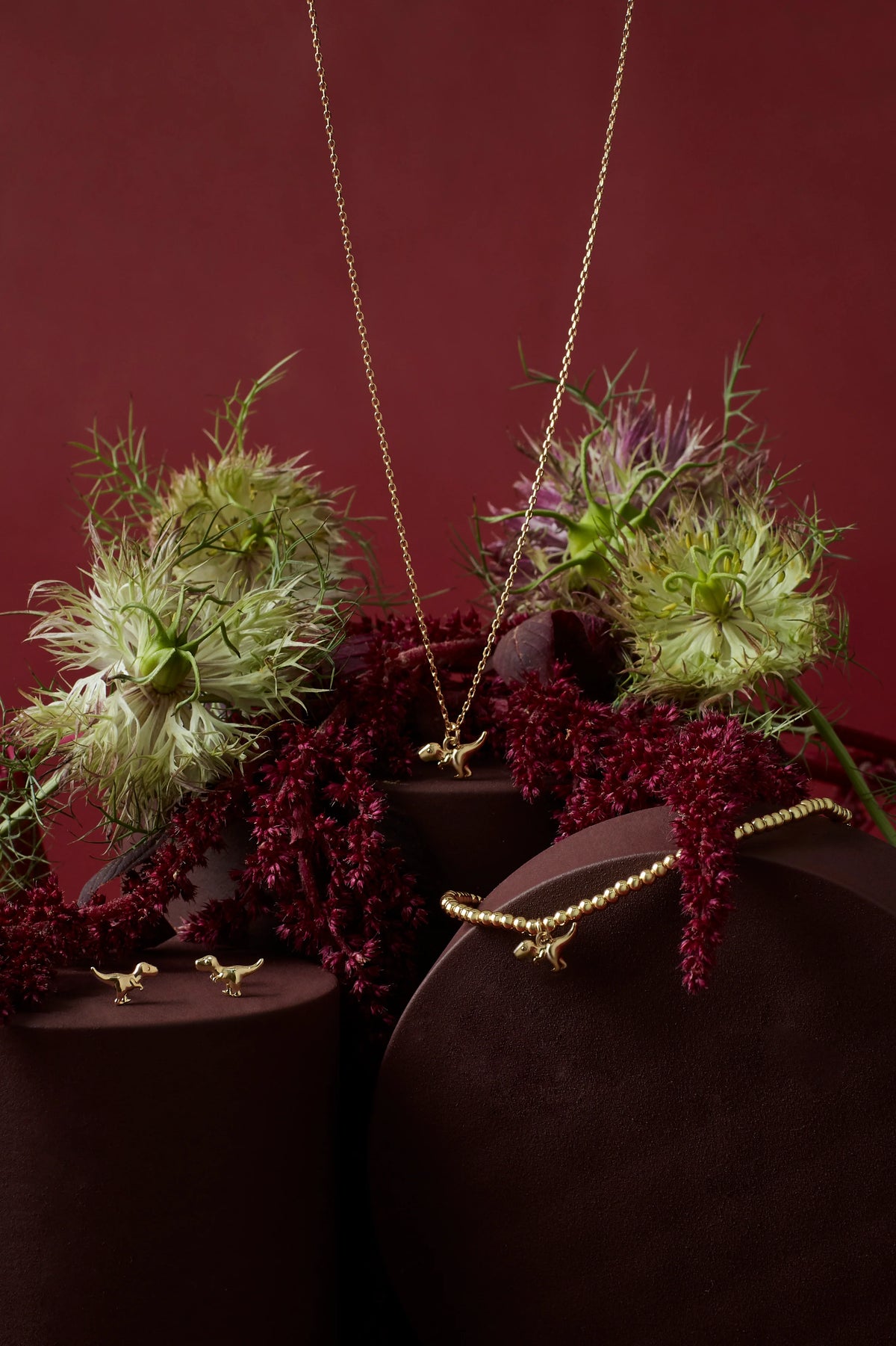 The chain measures 41-46cm. The T-rex pendant measures approximately 10x7mm.